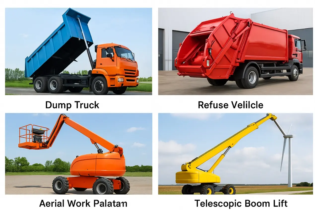 Damperli kamyonlarda, ağır yüklerin hızla boşaltılmasını sağlamak amacıyla taşıyıcıyı kaldırmak için sıklıkla çok kademeli hidrolik silindirler kullanılır; Sıhhi çöp kamyonlarında, verimli çalışmayı sağlamak için hidrolik silindirler arka kapak açma ve sıkıştırma sistemini çalıştırır; hava platformları veya makaslı kamyonlar gibi hava çalışma platformlarında kaldırma kolunu kontrol ederler ve çalışma platformunu sabit bir şekilde yükseltirler; Ayrıca tarımsal damperli kamyonlar, treyler hidrolik arka panelleri ve inşaat kazık çakıcıları da çalışma eylemlerini tamamlamak için güvenilir çok kademeli teleskopik özelliklerine güvenmektedir.